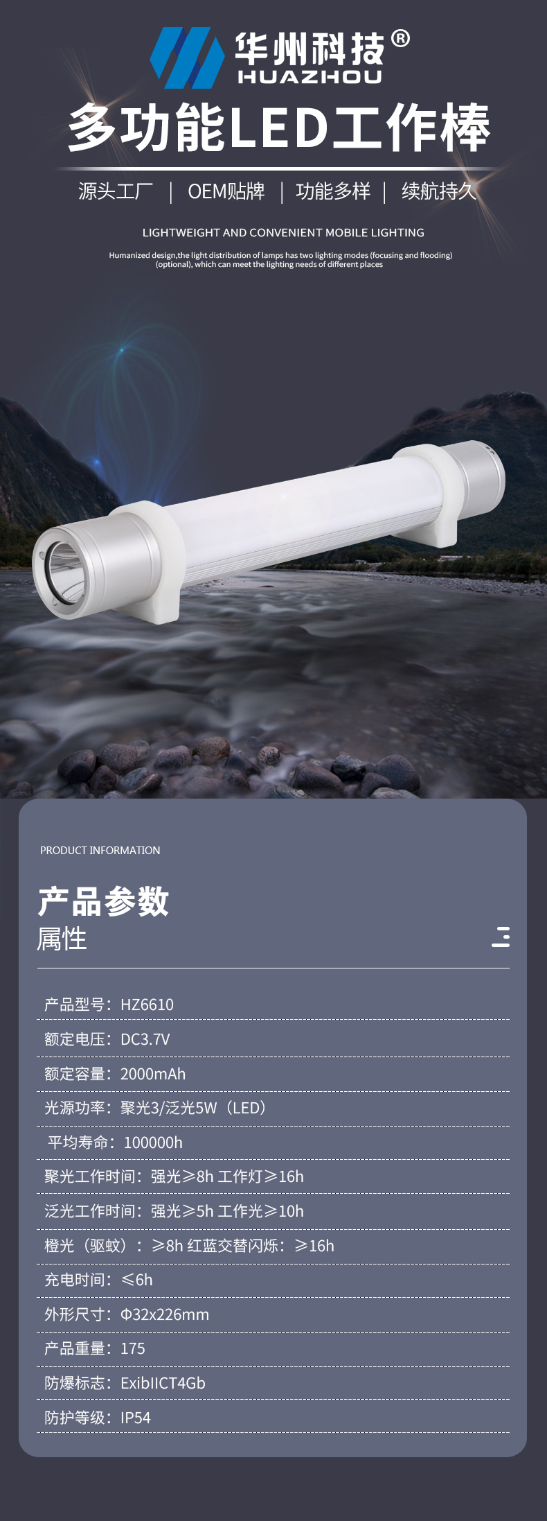 额定电压:3.7V 额定功率:5/3W 额定容量:2Ah 防爆标志:Exib IIC T4 Gb 防护等级:IP54 产品尺寸:Φ32x226mm 产品重量:175g 产品描述:灯具适用于II类易燃易爆场所,作为检修、抢险、救灾、巡检、示警等工作照明和应急照明及信号指示使用,配备手电功能、泛光功能、驱蚊功能、红蓝警示灯功能、手电及泛光二种亮度可调,单键控制开关和一键快速开关功能。
