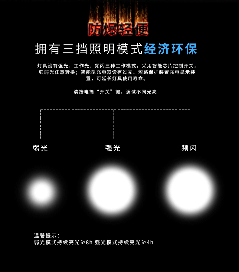 额定电压:3.7V 额定功率:3W 额定容量:2.6Ah 防爆标志:Exib IIC T4 Gb 防护等级:IP66 产品尺寸:Φ46x50x225mm 产品重量:470g 产品描述:本产品广泛适用于油田、石化行业作业现场,作为客户夜间值勤人员巡检照明,带有电量显示装置,可伸缩灯头实现聚、泛光调节,灯头可旋转90°,可采用手持、磁力吸附等工作方式,非常方便。